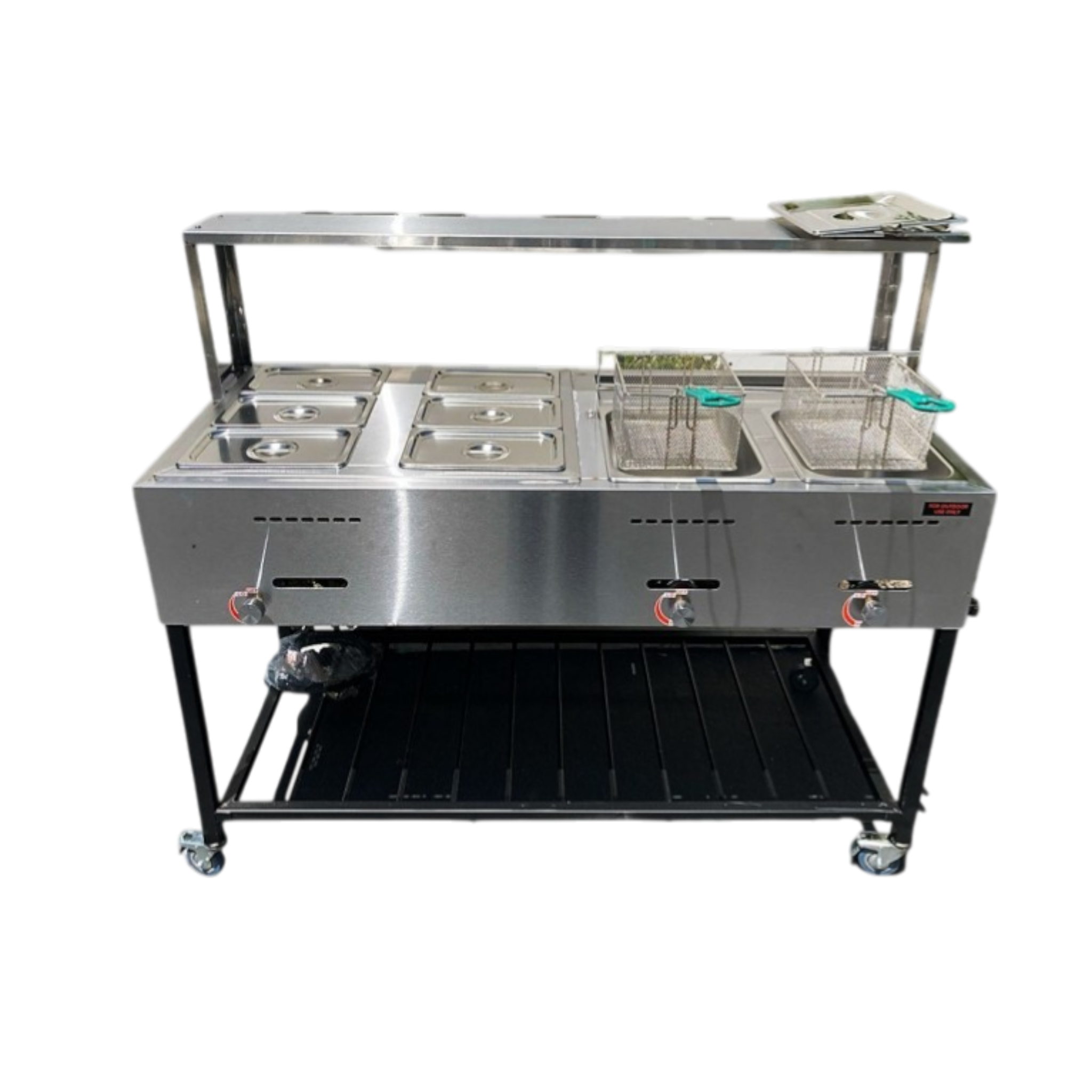 Includes: 3 pressure burners, 6 steamer trays with steel inserts, 2 fryer with tray basket and drip tray and shelf with counter