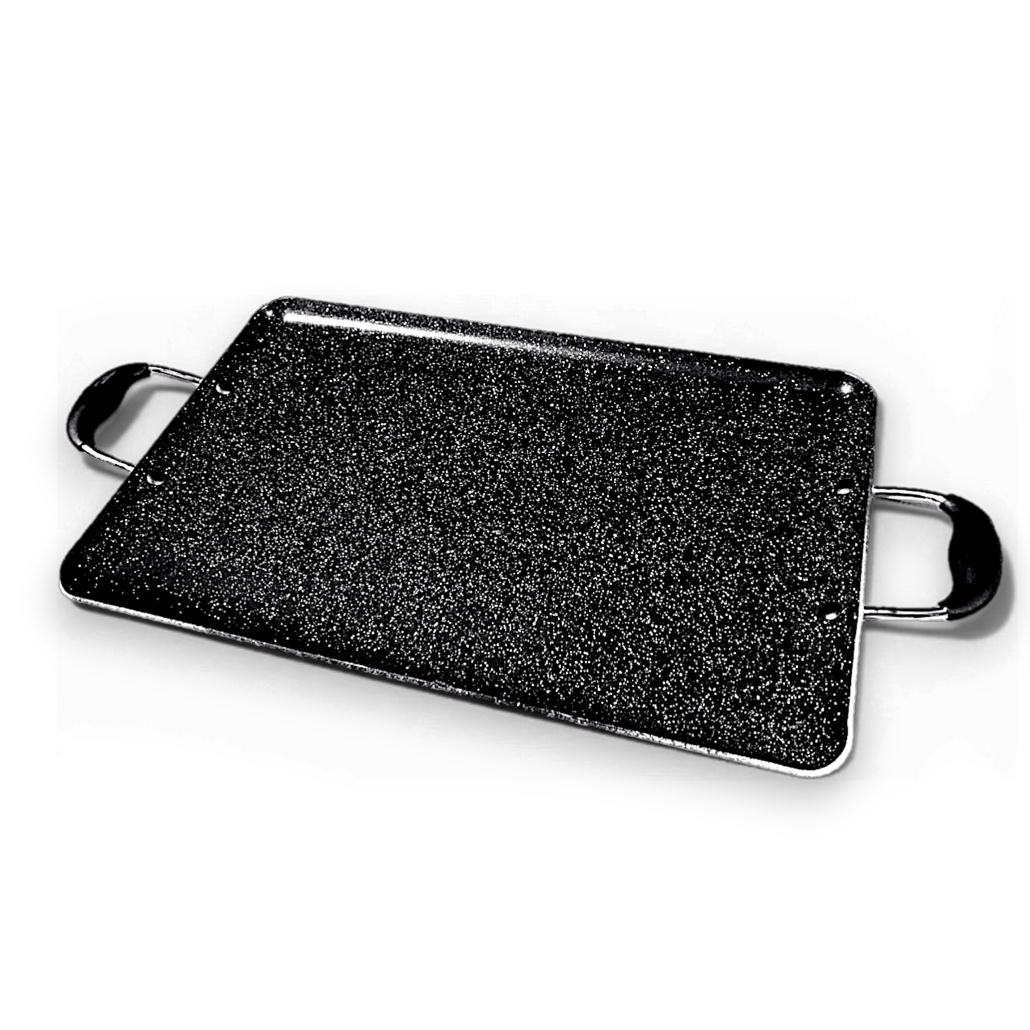 Non-Stick Double Griddle features a striking black and white speckled marble finish. Measuring 48cm x 29cm (19″ x 11.5″), this 4mm gauge double comal delivers two versatile cooking zones with superior heat retention, even distribution, and long-lasting durability. The premium non-stick marble coating ensures effortless food release, reduced oil usage, and fast cleanup.