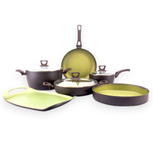 - Includes: 9″ Fry Pan, 11″ Fry Pan, 8″ Sauce Pan with Lid, 11″ Sauté Deep Pan with Lid (5-qt.) & 12.5″ Stock Pot with Lid (13.6-qt.)