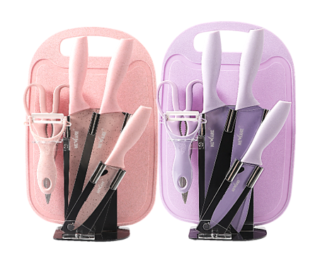 Stainless Steel 7 piece knife set with storage cutting board (pink/purple)-1807