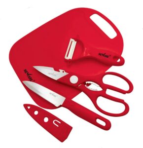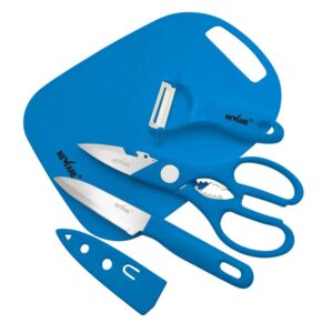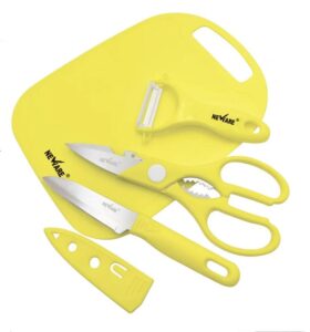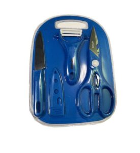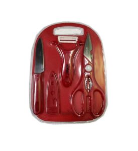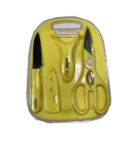 The 4-piece set includes a Fruit Knife, Peeler, Scissors, and Mini Chopping Board.