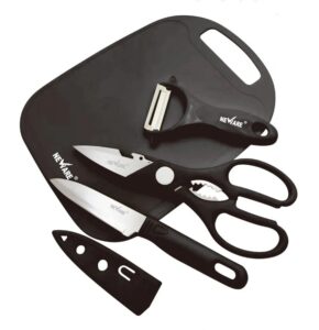 Neware's Marble Black 6 piece stainless steel  knife set with  Auti-rust, non-stick coating great for cutting meat • The blade surface is food-grade anti-rust layer, easy to clean • Durable sturdy knife handle • Curved design knife handle provides sturdy grip and comfort • Gift box packaging Packaging includes: 1 Peeler, Chef Knife, Bread Knife, Utility Knife, pairing knife and slicing knife Item#1806-M
